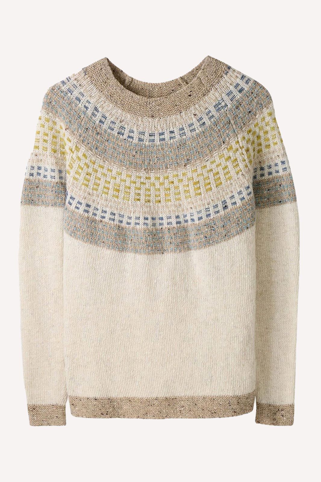 Our designers have used a pretty float-stitch detail to give the curved yoke a little extra charm, while the crew neckline, hem and cuffs are all designed with a purl knit for subtle contrast.