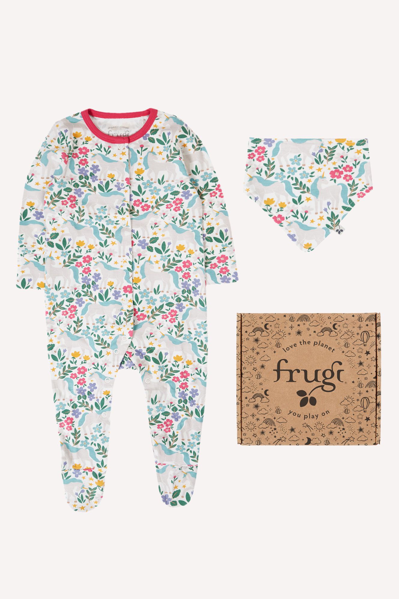 This baby gift set is just a postbox away! Beautifully packaged in a letterbox-sized gift box, Frugi's Unicorn Forest Gift Set is ready to go - no need to wrap. They've crafted this 2-piece set from snuggly soft GOTS certified organic cotton - grown by farmers we trust, with no nasties, making it wonderfully gentle next to delicate new baby skin. Perfect for celebrating a new arrival, it contains our classic Lovely Babygrow and a matching bib.